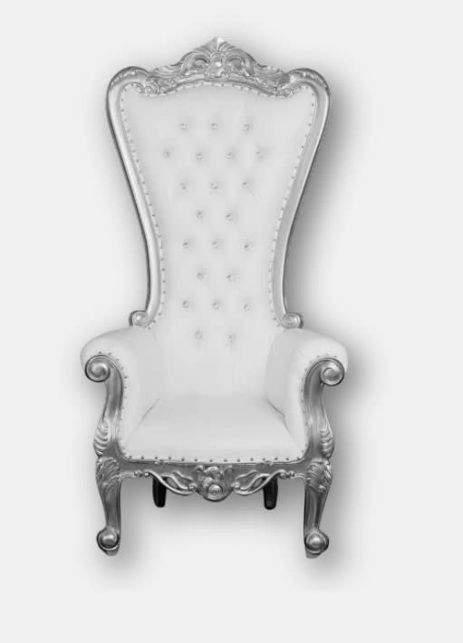 Make a statement with the Throne Chair (Adult) - White & Silver. Add regal style to your next event or space. Reserve yours today and create lasting memories. ✨👑