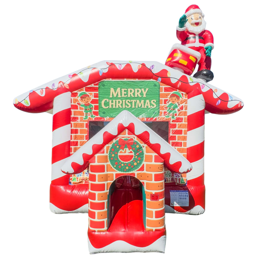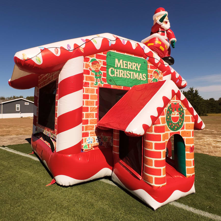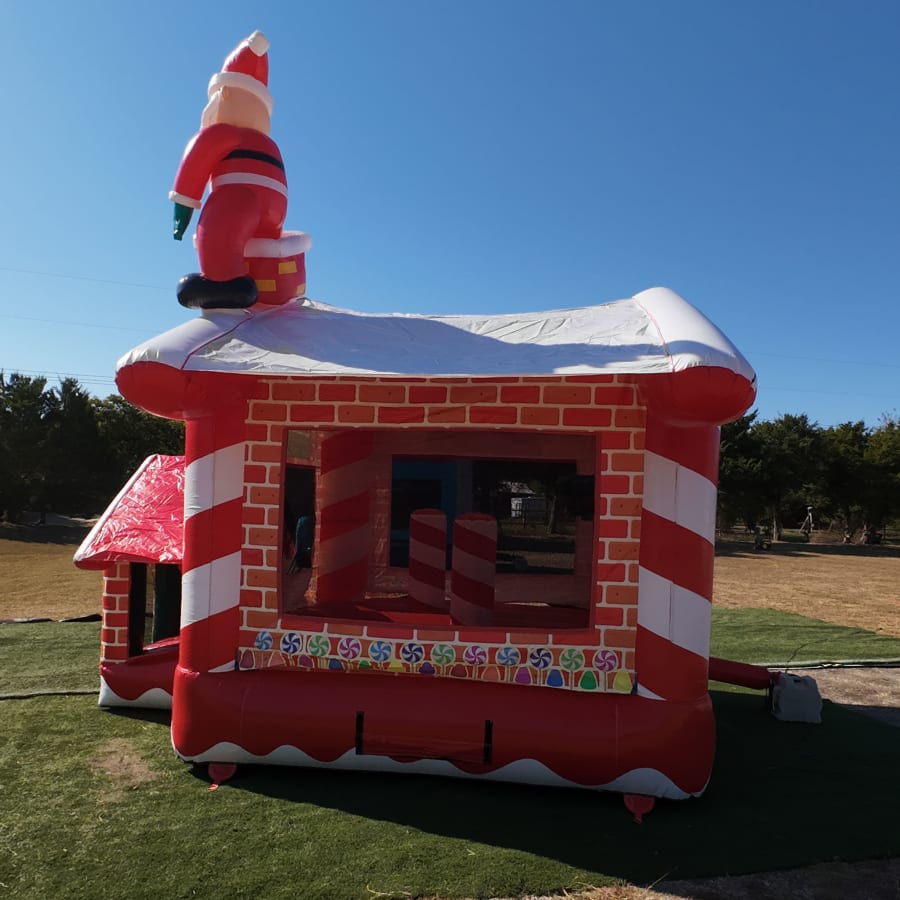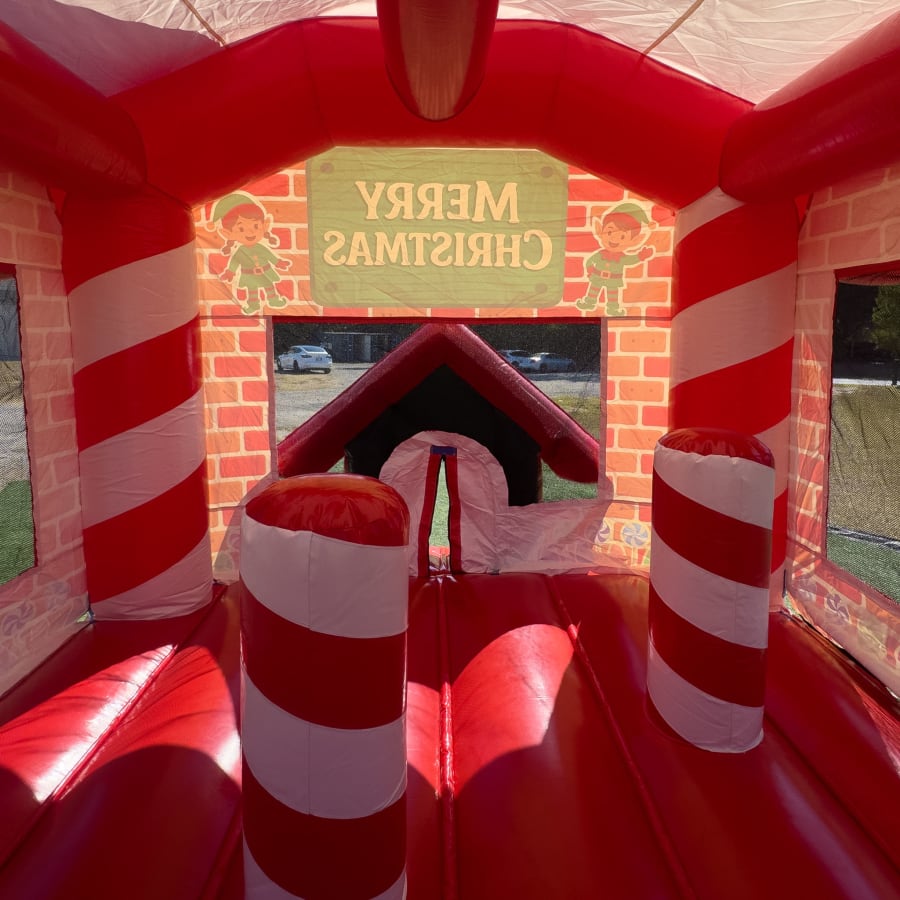 Bring instant holiday magic with the North Pole Playhouse inflatable jumper. This Christmas-themed jumper features a gingerbread house façade, bright candy cane accents, and a jolly Santa waving from the rooftop. At 15’ L x 14’ W x 19’ H, the North Pole Playhouse offers a roomy, safe play area for kids to bounce, laugh, and celebrate. Perfect for holiday parties, winter festivals, school events, and church gatherings. ✨