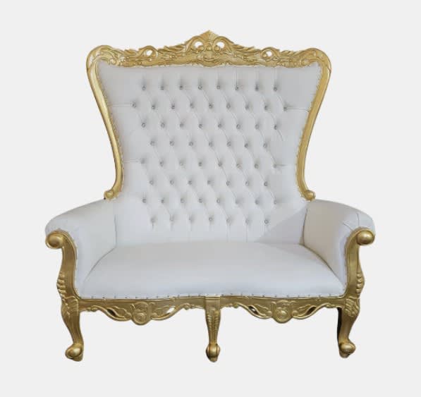 The White & Gold Double Throne Chair - Bench pairs timeless design with ergonomic comfort. The high back supports posture. The wide bench allows relaxed seating for two. Upholstery is smooth and easy to maintain. The gold accents catch light and add elegance to photos. 👌