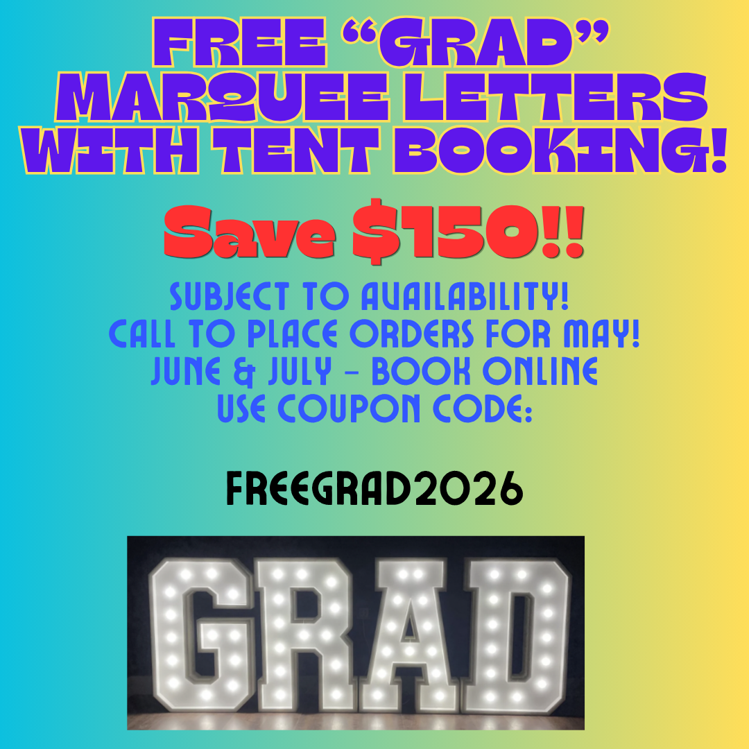 (For June & July - during the reservation process - please add the GRAD marquees to your cart and apply the discount code below)